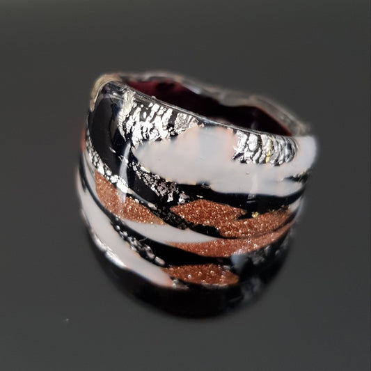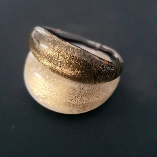 Anello a fascia con foglia oro24kt, fantasia bianco e nero in vetro di Murano lavorato a lume.