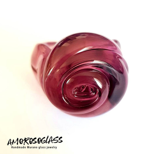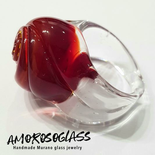Anello BOCCIOLO in vetro di Murano colore rosso intenso trasparente con base anello in cristallo trasparente.