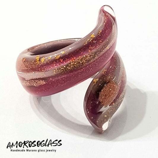 Anello a spirale in vetro di Murano con foglia oro e avventurina. Fantasia rubino e ametista in pasta.