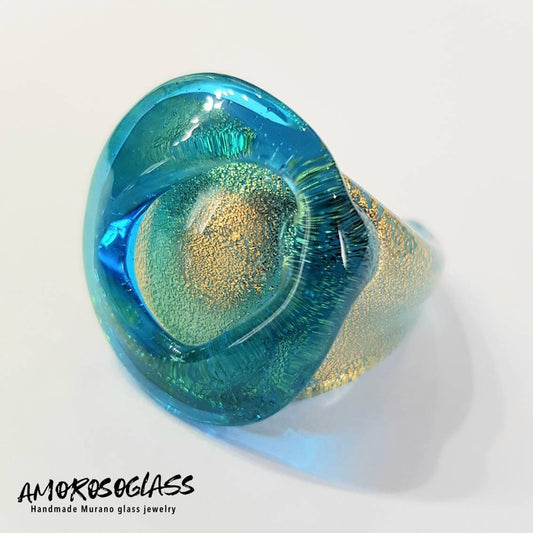 Anello acquamare in vetro di Murano con foglia oro 24Kt.