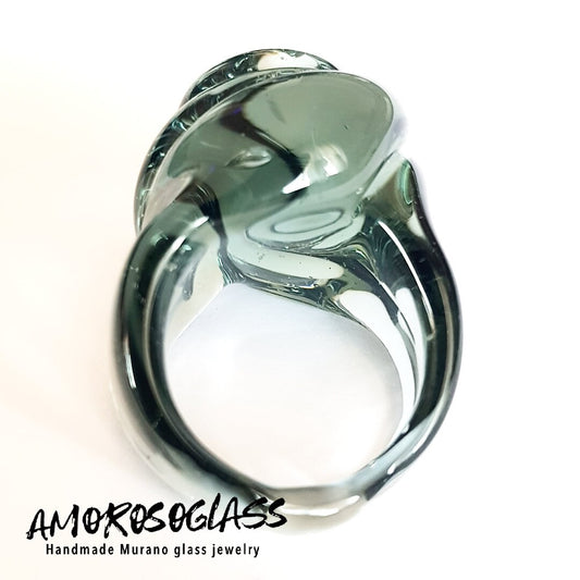 Anello BOCCIOLO in vetro di Murano colore acciaio trasparente.