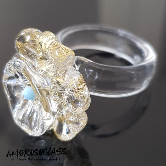 Anello BEATRICE in vetro di Murano a forma di fiore con foglia oro 24kt e puntino centrale colore celeste in pasta.
