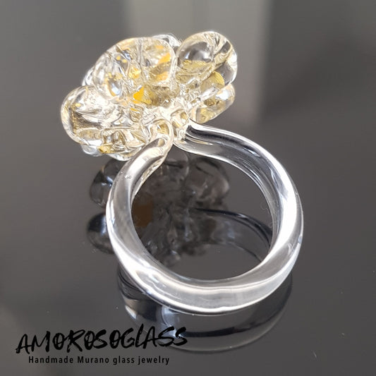 Anello BEATRICE in vetro di Murano a forma di fiore con foglia oro 24kt e puntino centrale colore giallo in pasta.