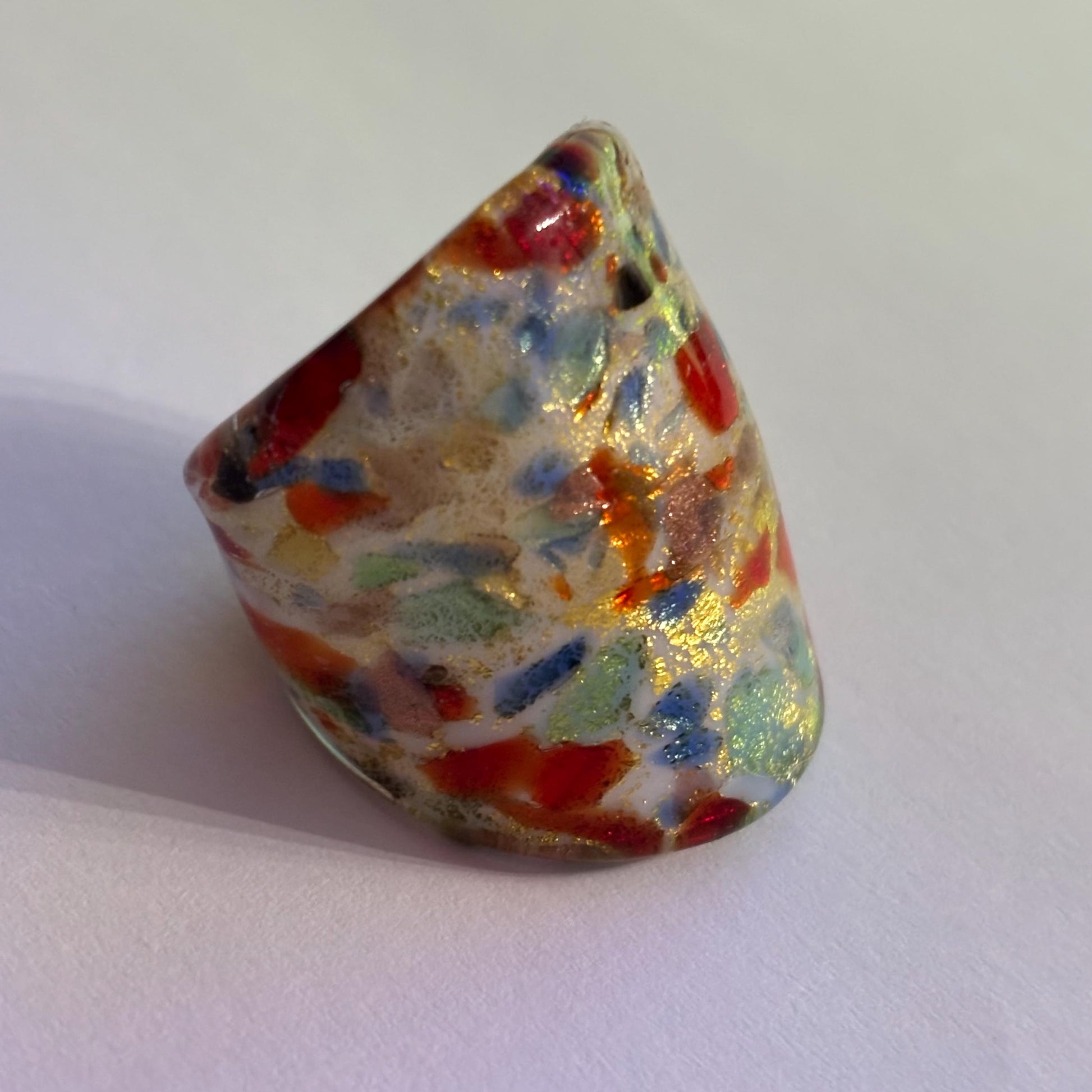 Un anello unico, realizzato con l'arte del vetro di Murano lavorato a lume. Modello arlecchino multicolor. La foglia oro 24 Kt aggiunge un tocco di luminosità al gioiello.